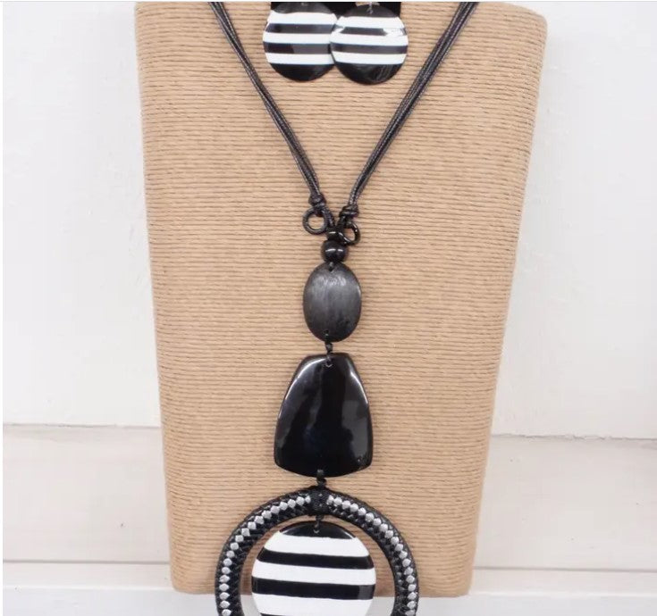 This fashionable Black Wax Cord features a chic Black and White Round Resin Pendant and earrings, a contemporary style popular this season.