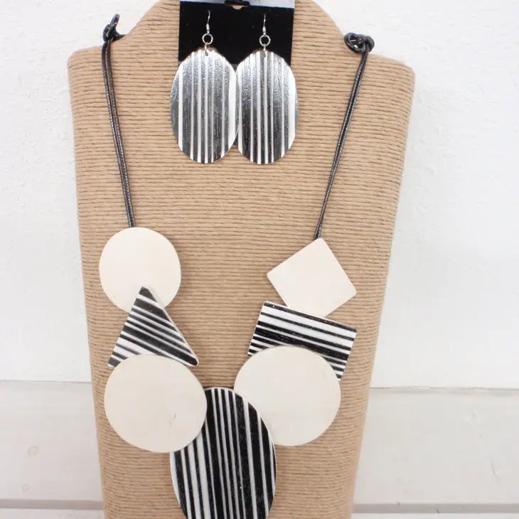 This Black and White Stripe Necklace Set boasts a stylish design with assorted wood accents for a unique aesthetic.