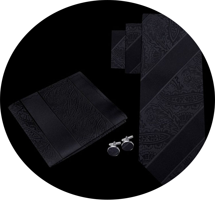 Black Paisley Stripe Formal Necktie Set with Cuff Links and Pocket Accent