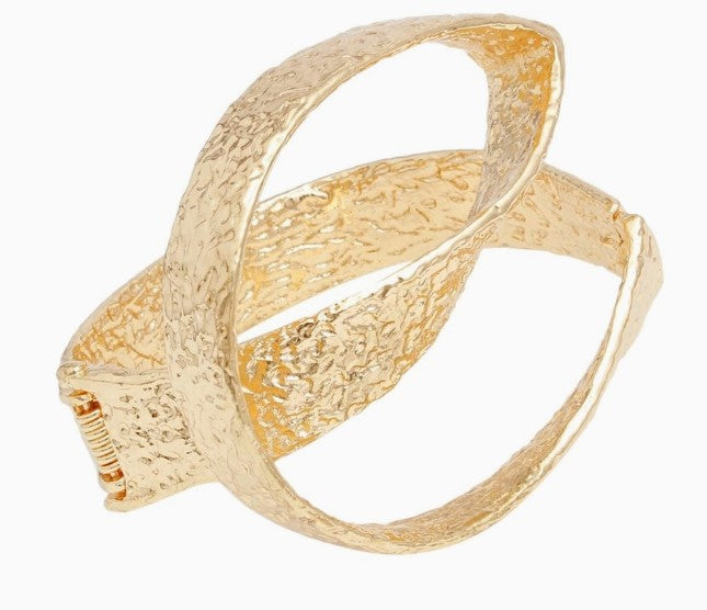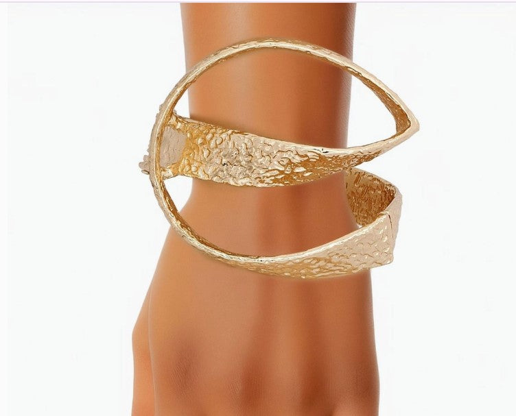 Women's Cuff Bracelet. Artistic 3D Folded Design Gold Hammered Metal Cuff Bracelet Featuring Hinge Opening. Detail measures 2.5" x 3". Metal measures .75" wide.